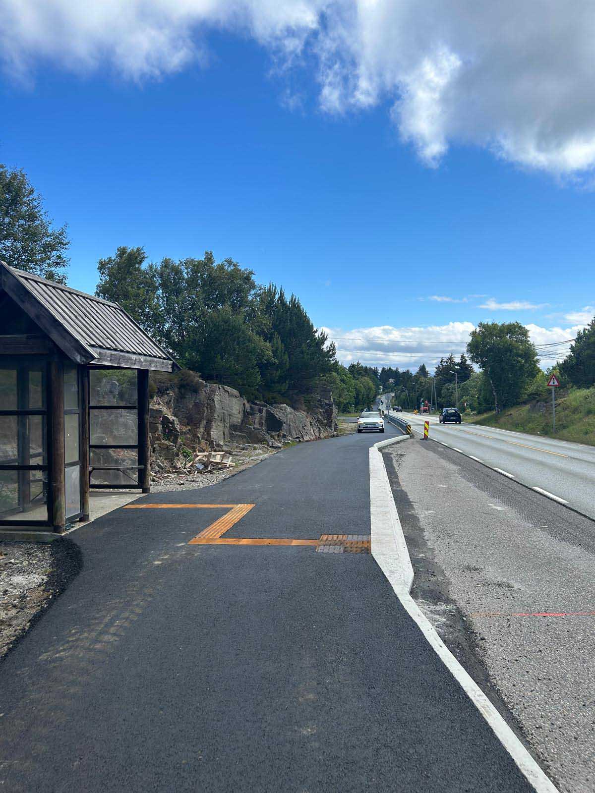 Vi har ferdigstilt denne nye busslommen, med universell utforming og nylagt asfalt, for tryggere og mer tilgjengelig kollektivtrafikk.