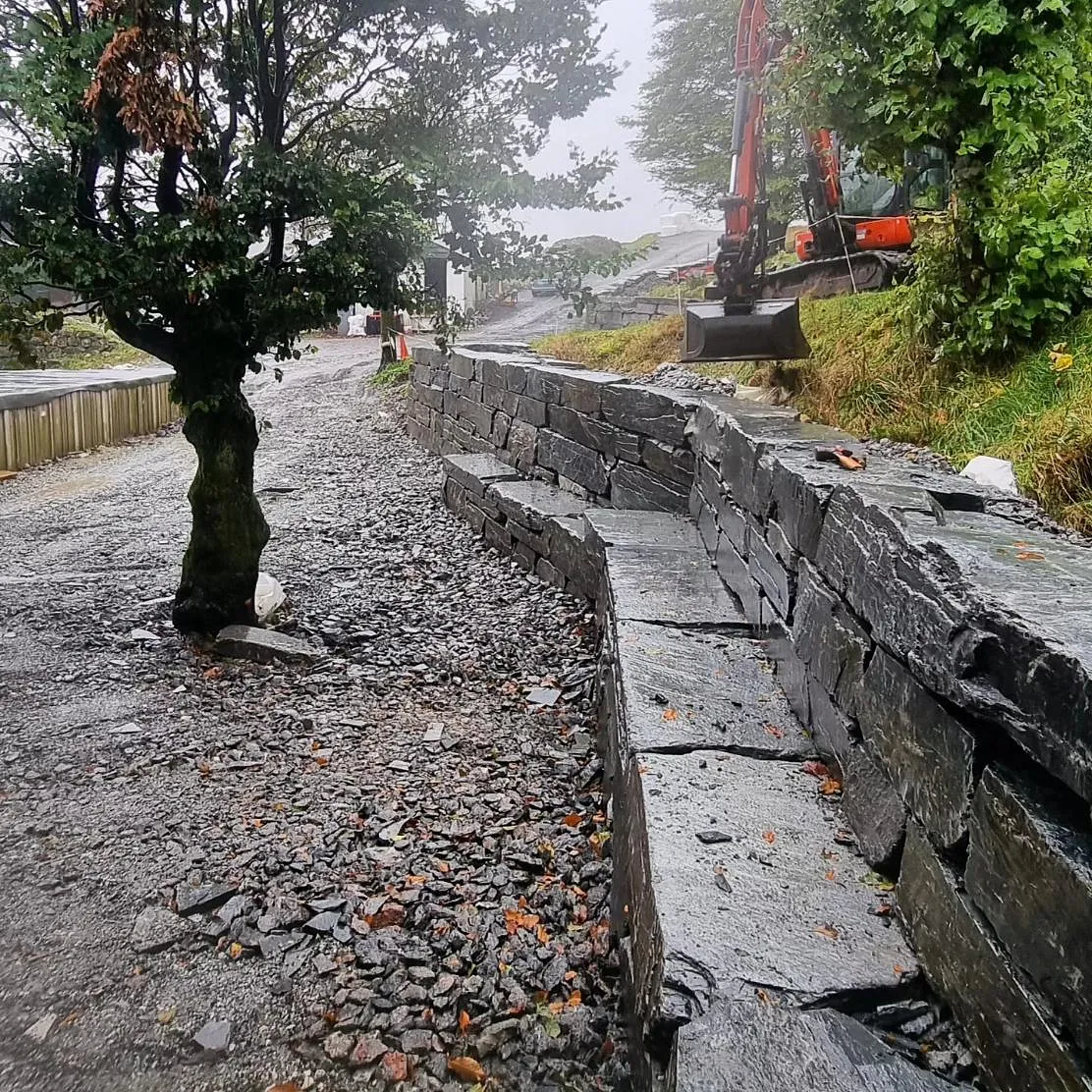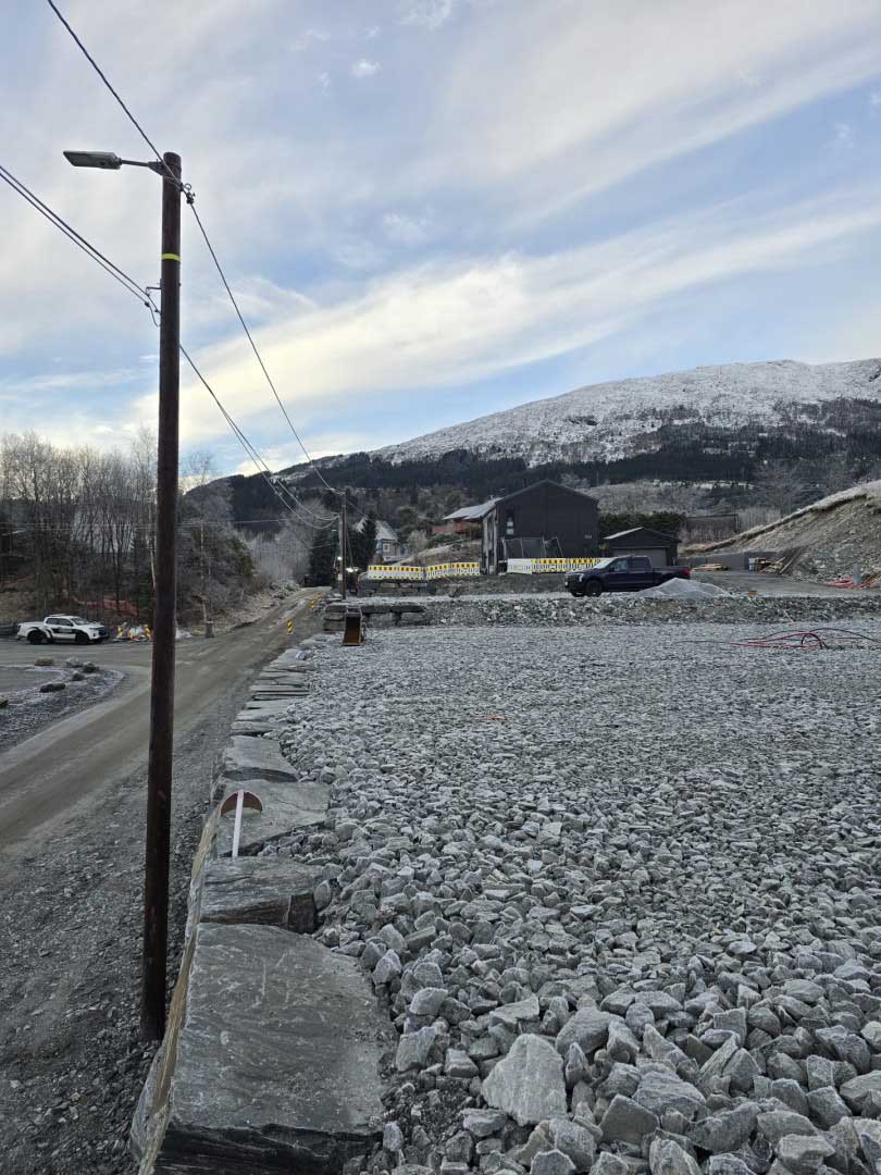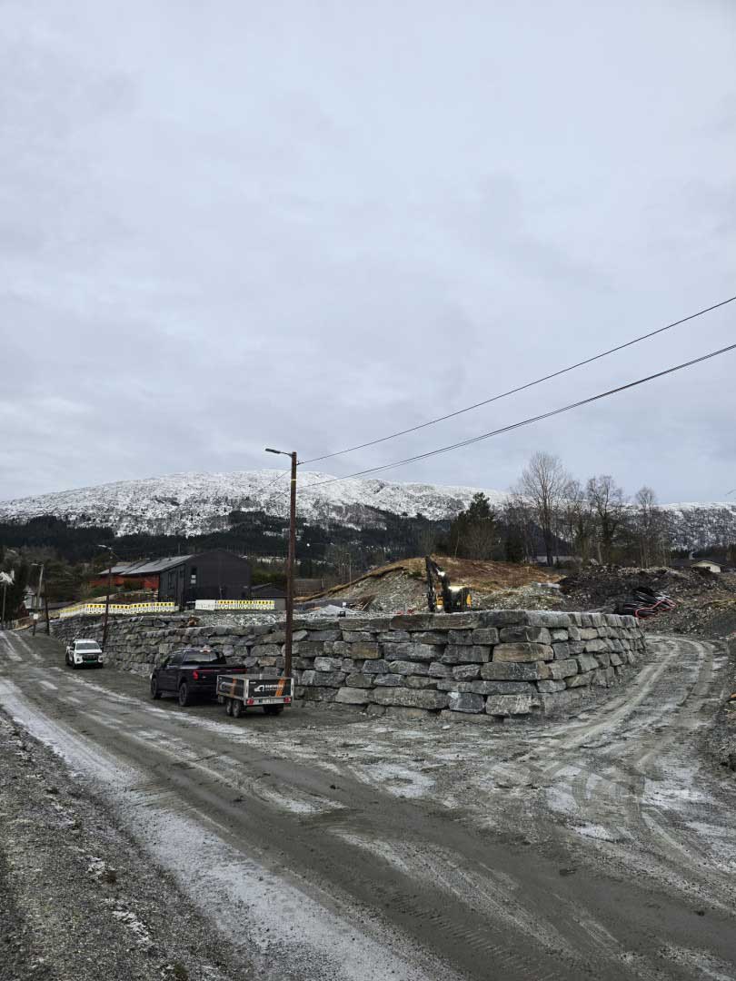 Arbeidet innebar av graving, skyting, støyvoll, natursteinsmuring, VA-grøfter og grovplanering.